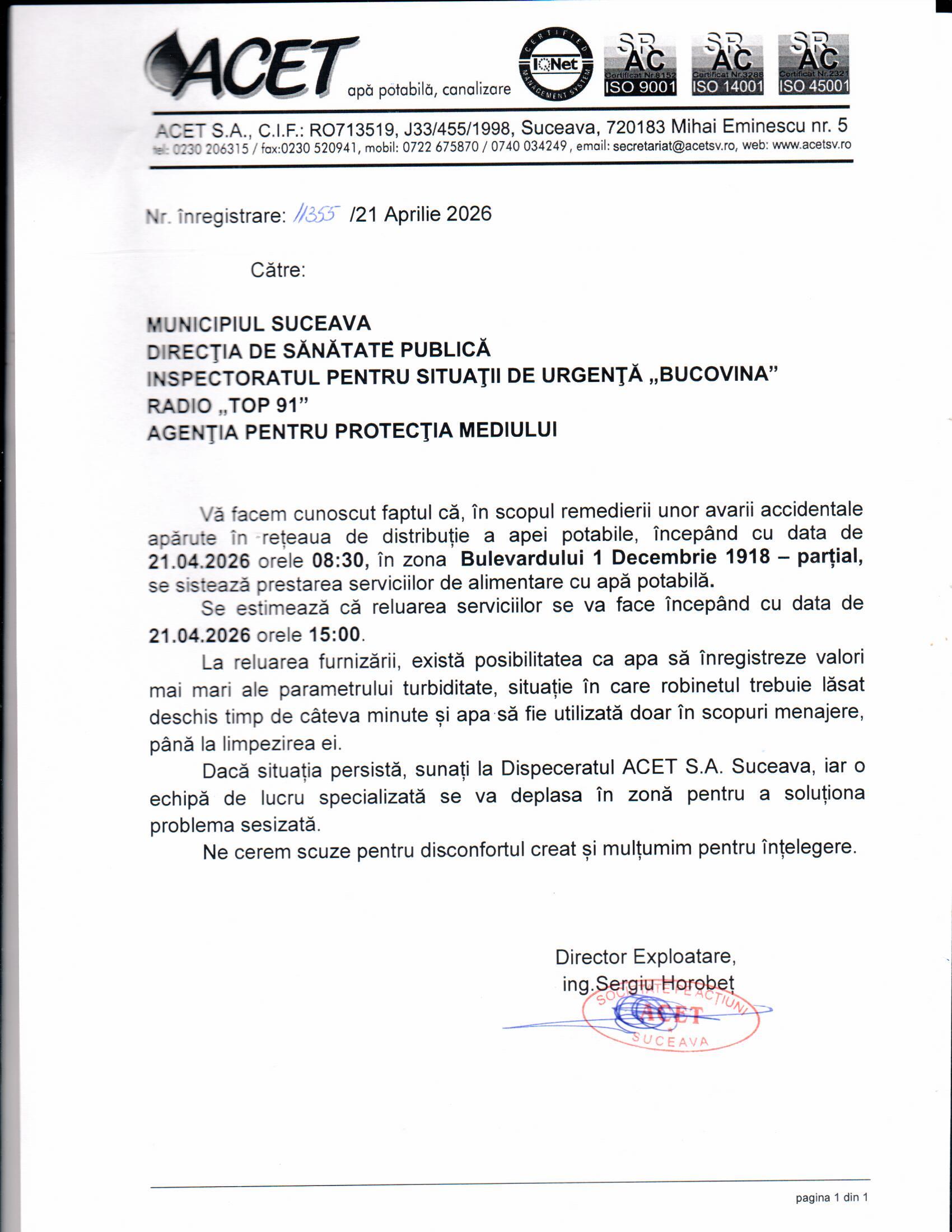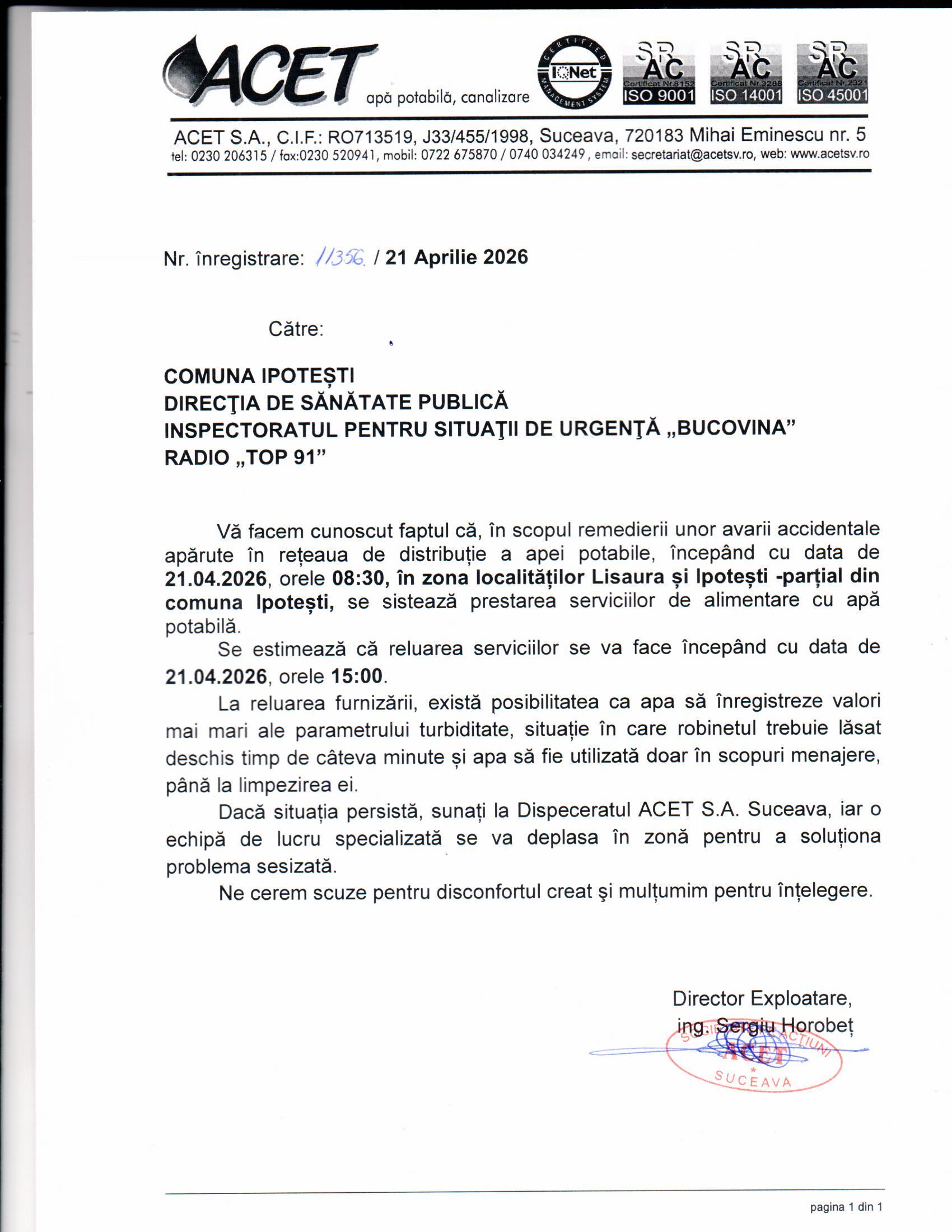 Anunțuri sistare serviciu public de alimentare cu apă potabilă,începând cu data de 21.04.2026 ora 08.30 în zona localităților Lisaura și Ipotești – parțial din comuna Ipotești și zona Bulevardul 1 Decembrie 1918 ,Suceava se estimează că reluarea serviciilor se va face în data de 21.04.2026 orele 15.00